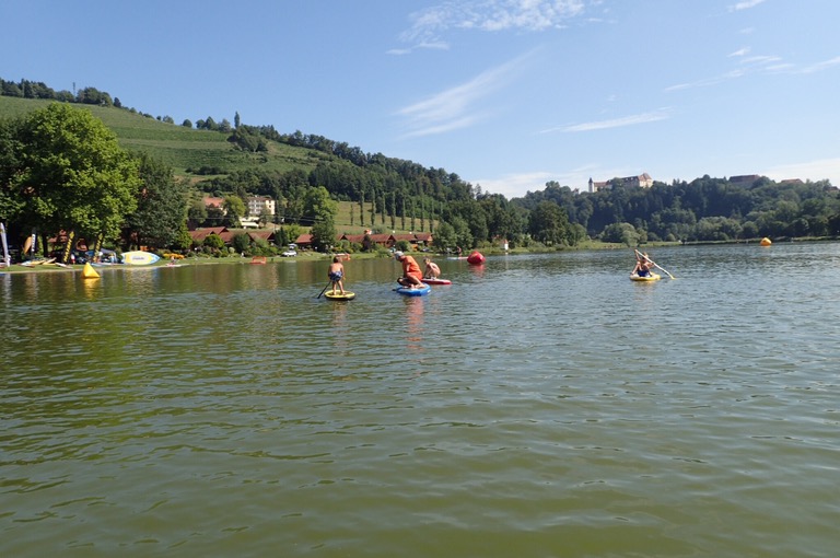 Das Besondere am Sulmsee ist neben seiner schönen Lage aber der SUP-Club mit seinem eigenen Clubhaus und seinen vielen Aktivitäten. Beim Club kann man sich auch SUP-Material ausborgen sowie duschen und umziehen.
