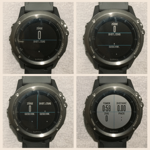Das Abrufen der einzelnen Trainings erfolgt bei der fenix 3HR etwas umständlich mit einem langen Druck auf die UP-Taste (Menü-Taste). Der Direktzugriff auf die einzelnen Sportarten erfolgt hingegen über die Start/Stopp-Taste. Anm.: Die Forerunner 735XT hat dies etwas logischer umgesetzt, mehr dazu im nächsten Test.