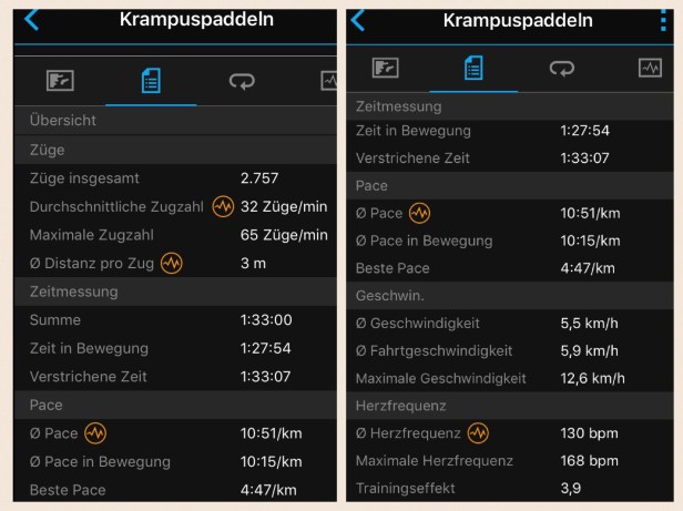 Für den Ruder- und SUP-Sport stehen dann auf Garmin-Connect folgende Grafiken und Statistiken am PC zur Analyse bereit.