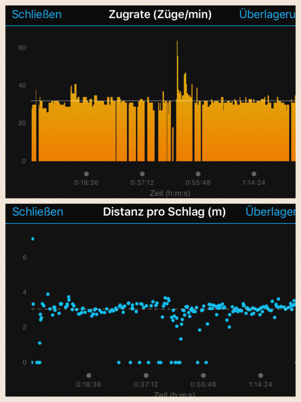 Neben den für alle Sportarten üblichen Anzeigefeldern der Kategorien Timer, Distanz, Pace, Geschwindigkeit, Herzfrequenz, Kalorienverbrauch und Uhrzeit stehen für Rudern und SUPen die sogn. ‚Schlagfelder‘ zur Auswahl: