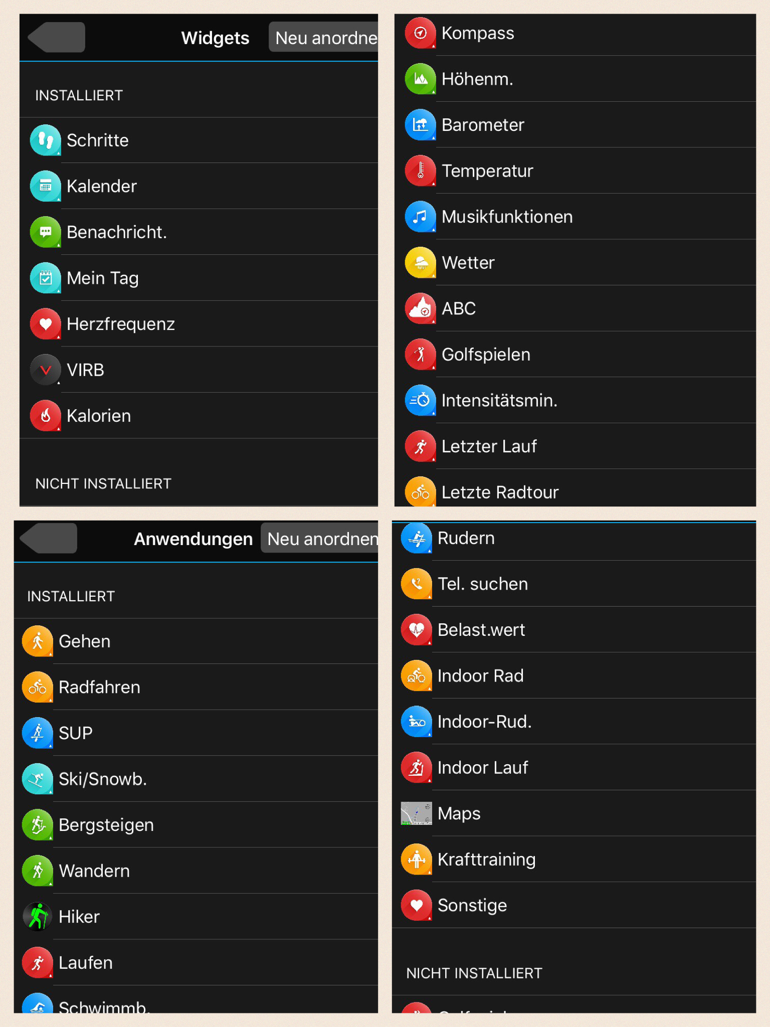 Widgets (oben) und Apps (unten) in der Garmin Connect-App am Smartphone
