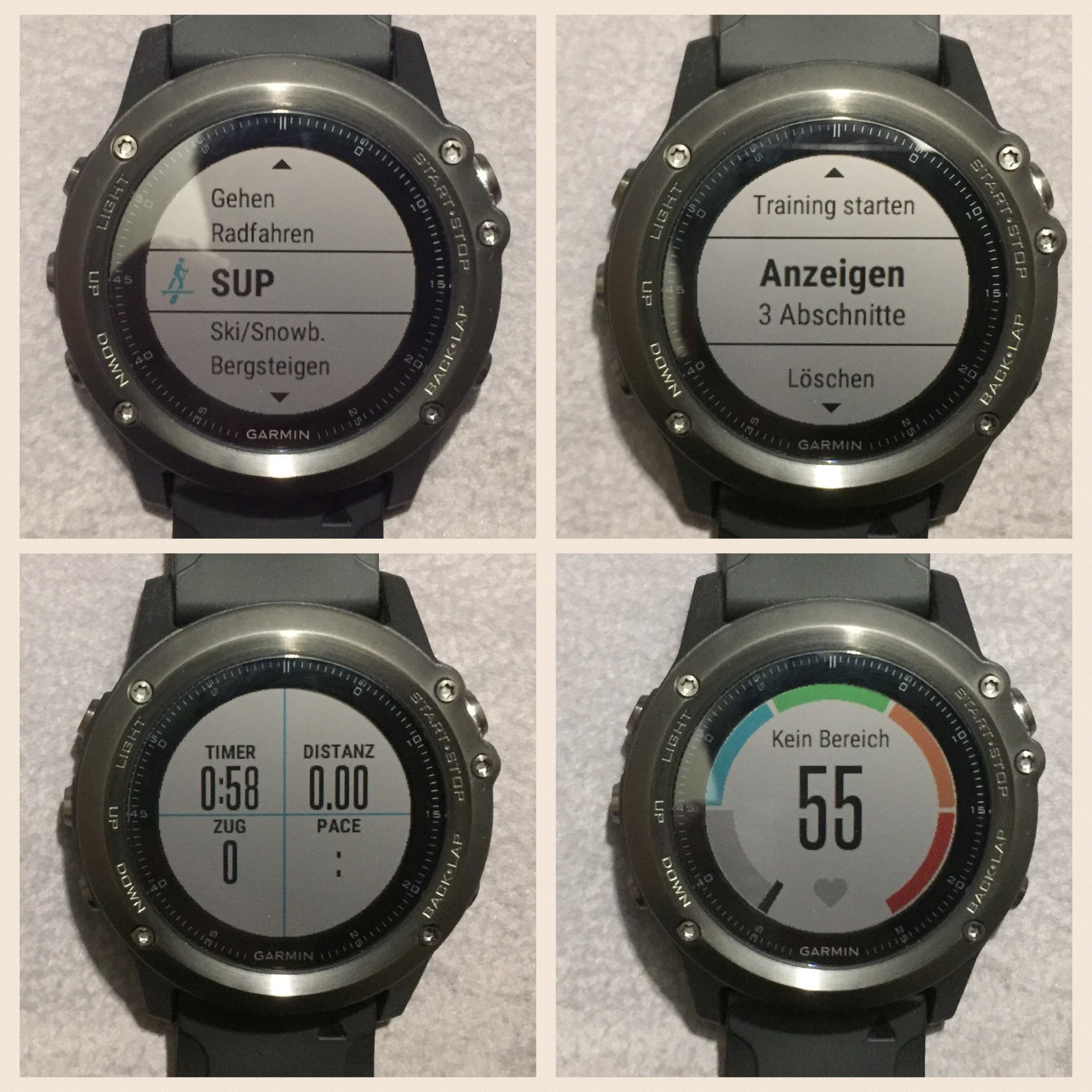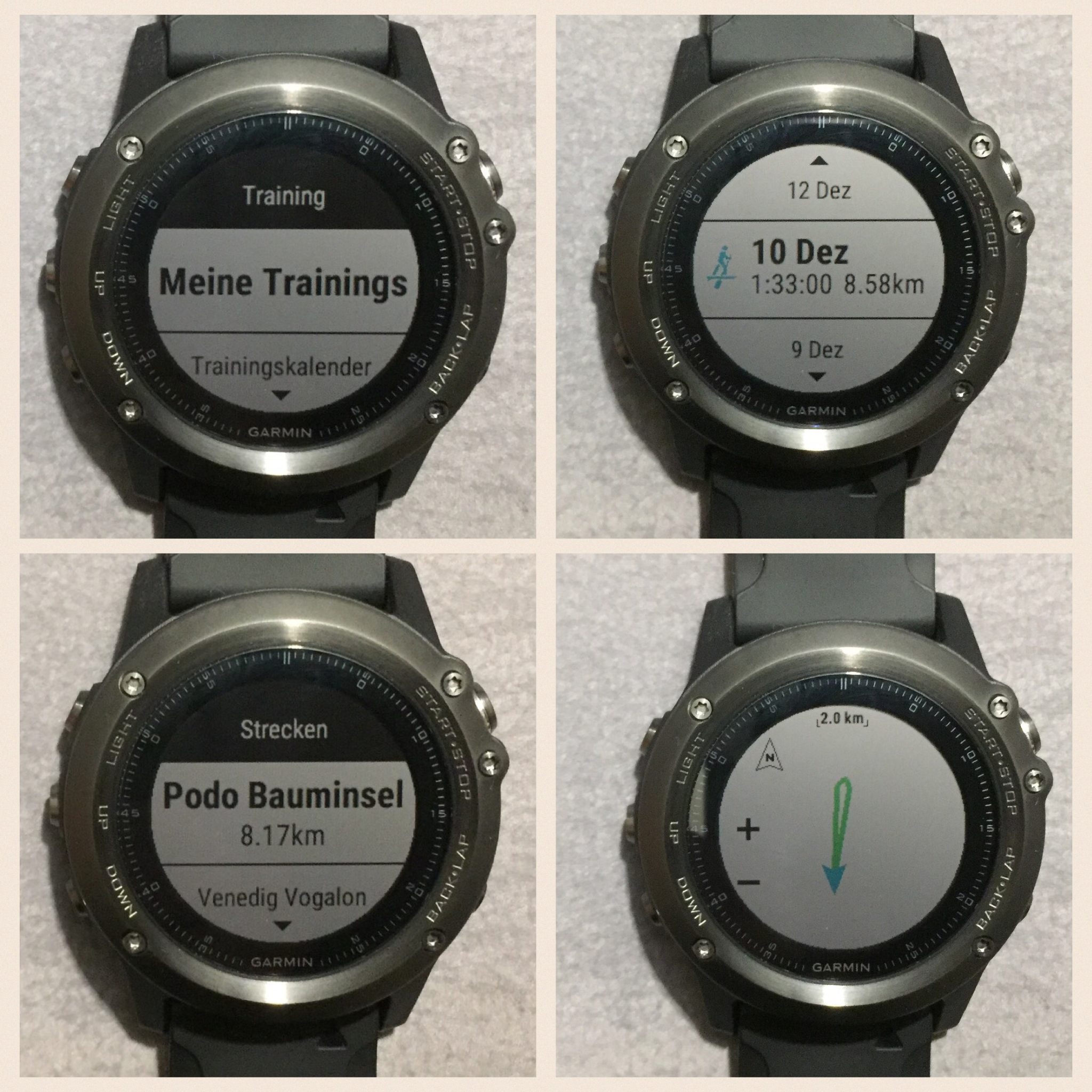 Das Abrufen der einzelnen Trainings erfolgt bei der fenix 3HR etwas umständlich mit einem langen Druck auf die UP-Taste (Menü-Taste). Der Direktzugriff auf die einzelnen Sportarten erfolgt hingegen über die Start/Stopp-Taste. Anm.: Die Forerunner 735XT hat dies etwas logischer umgesetzt, mehr dazu im nächsten Test.