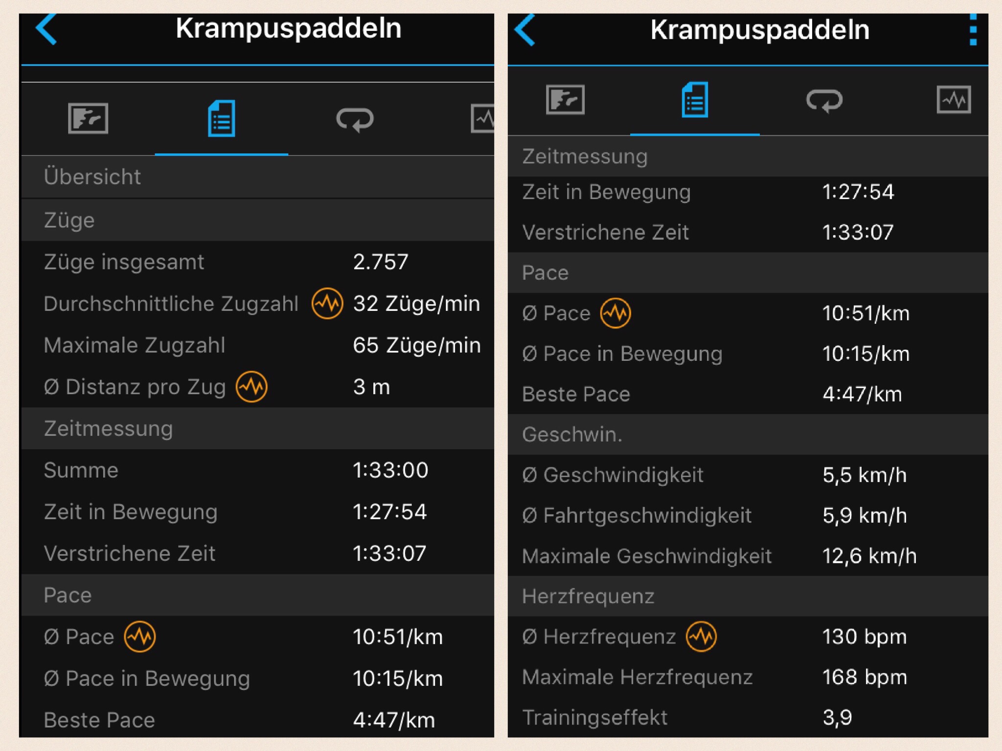 Neben den für alle Sportarten üblichen Anzeigefeldern der Kategorien Timer, Distanz, Pace, Geschwindigkeit, Herzfrequenz, Kalorienverbrauch und Uhrzeit stehen für Rudern und SUPen die sogn. ‚Schlagfelder‘ zur Auswahl: