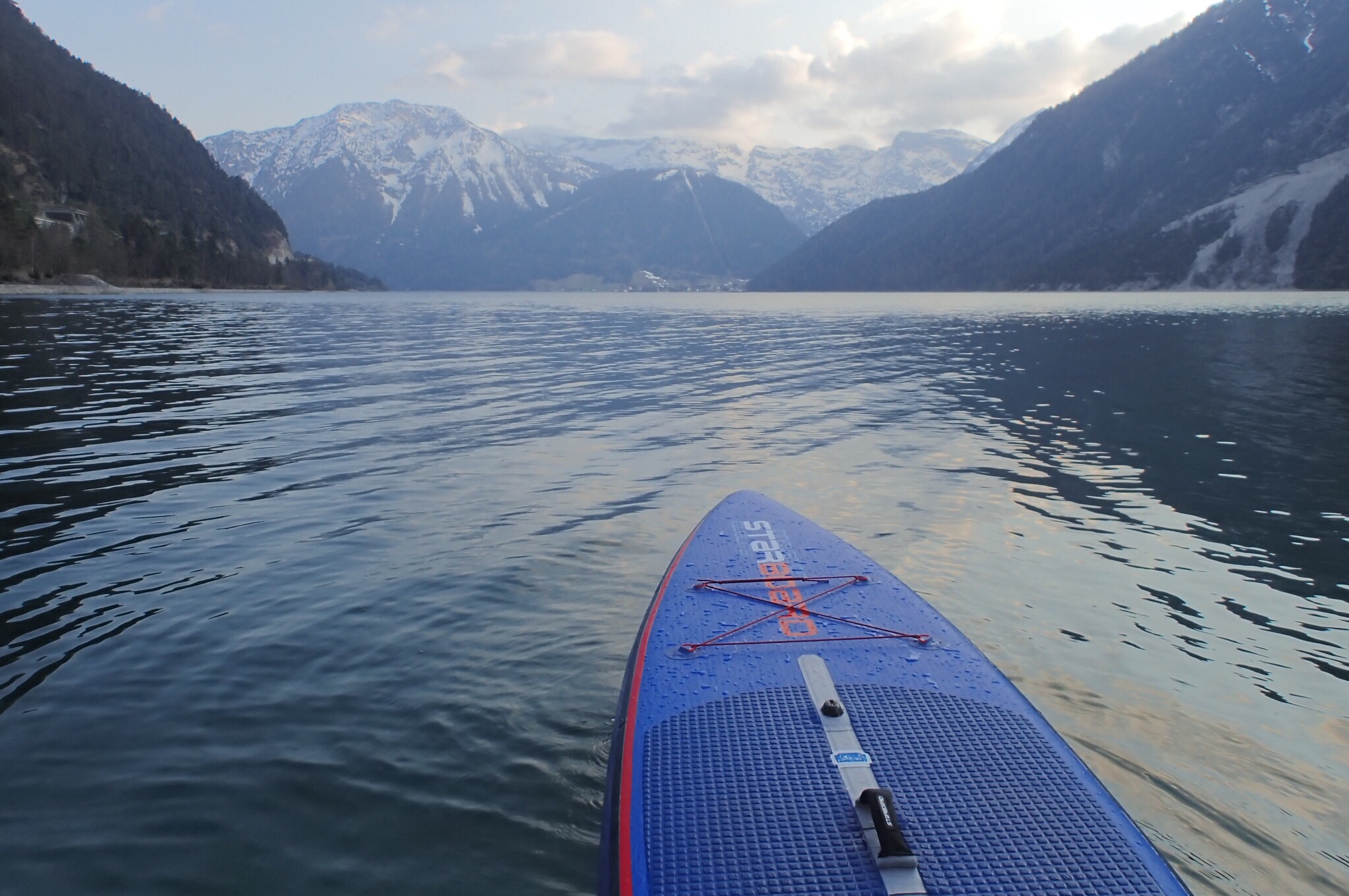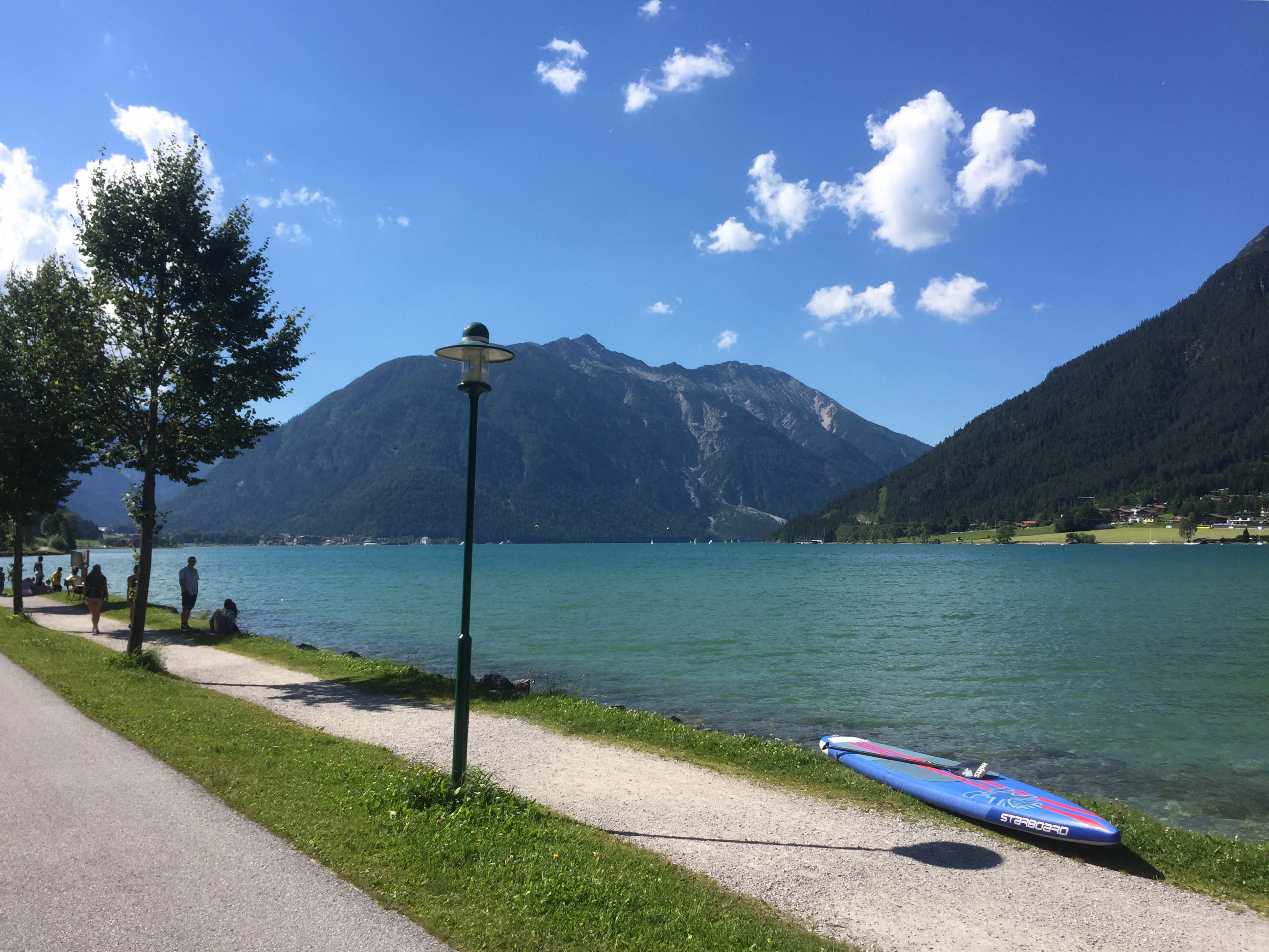 Bei unseren beiden Besuchen hatten wir unsere iSUPs von Starboard mit dabei. Jedesmal empfing uns ein mäßiger N-Wind. Wir starteten daher am Seespitz um zuerst gegen den Wind anzukämpfen. Als wir dann nach einer kleinen Pause beim Seestüberl ‚Campingplatz Schwarzenau‘ umkehrten, legte sich der Wind am späten Nachmittag und aus dem wohlverdienten Downwinder wurde leider nichts. Trotz der großen Konkurrenz in Bayern, empfehlen wir euch den Achensee, einen der schönsten Seen Österreichs, als SUP-Spot.