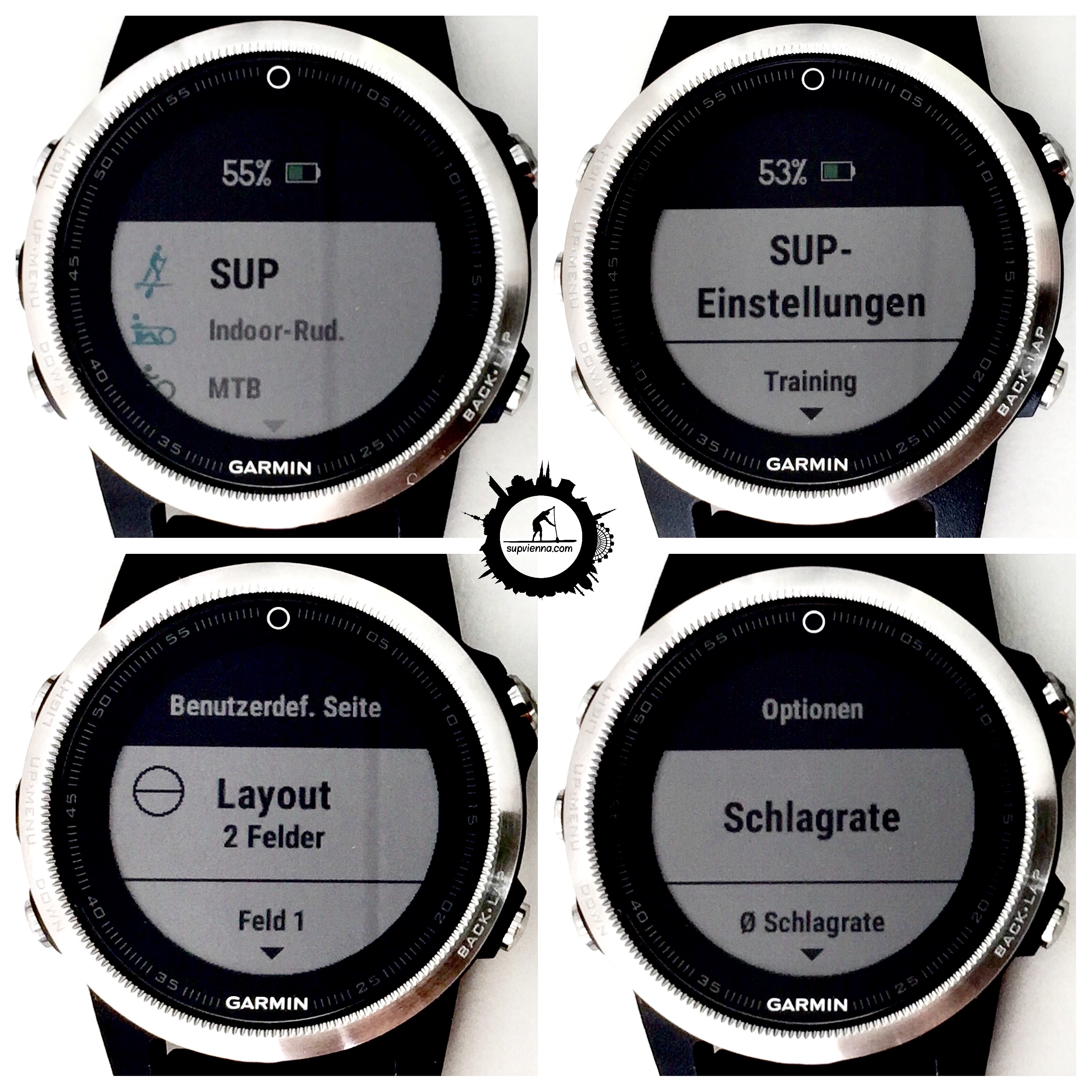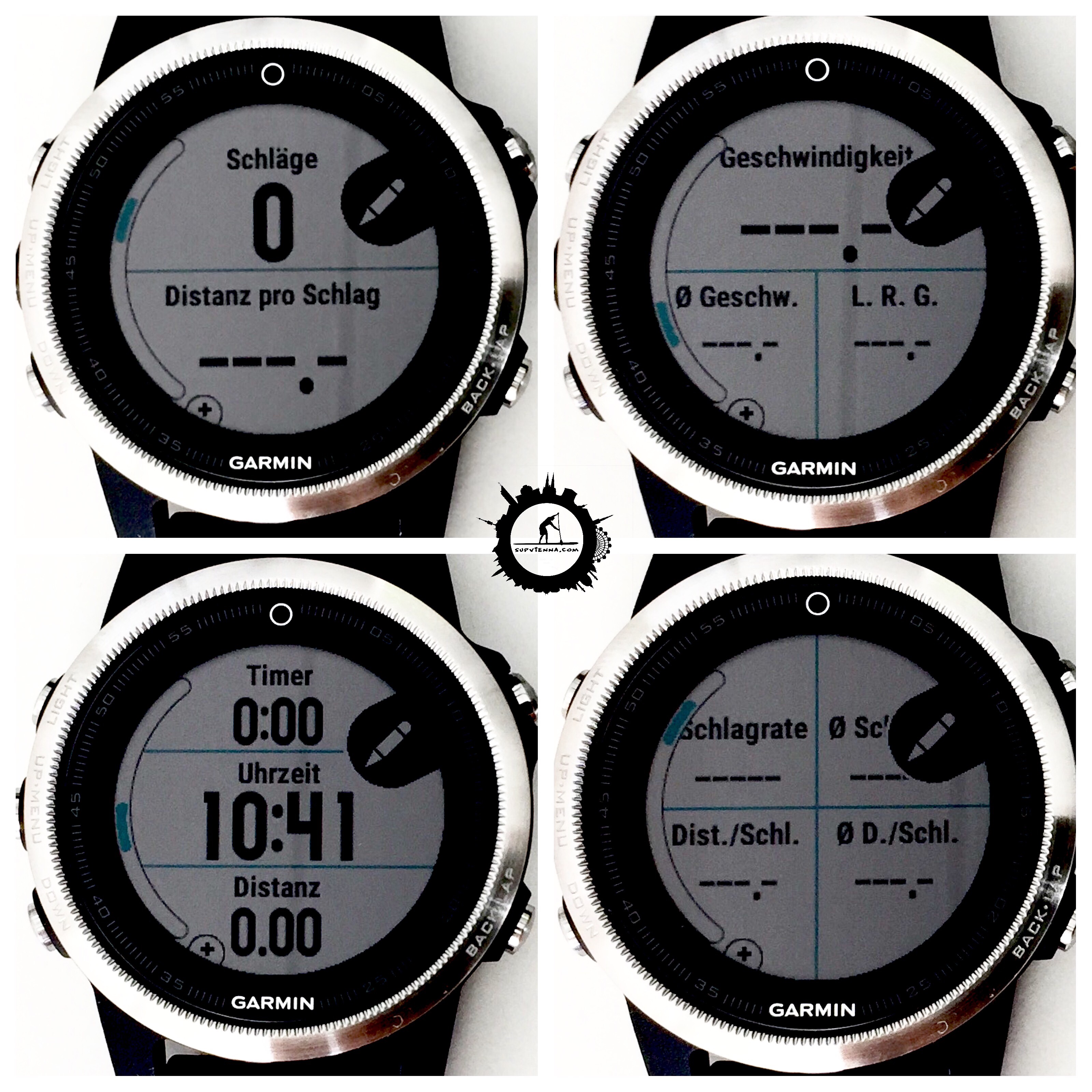 Neben den für alle Sportarten üblichen Anzeigefeldern der Kategorien Timer, Distanz, Pace, Geschwindigkeit, Herzfrequenz, Kalorienverbrauch und Uhrzeit stehen auch bei der fenix 5 für Rudern und SUPen die sogn. ‚Schlagfelder‘ zur Auswahl: