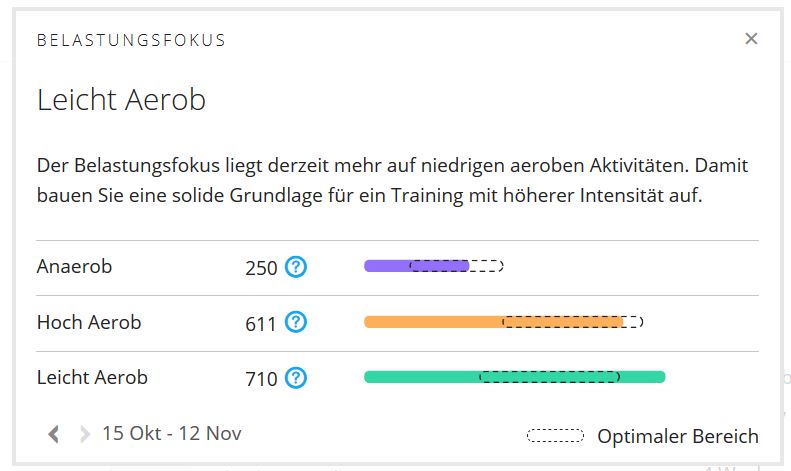 „Wenn das Garmin-Gerät eine Woche lang Daten erfasst hat, kann der Trainingsbelastungsfokus ermittelt werden. Dies ist eine geschätzte Einstufung der Gesamttrainingsbelastung in den drei Hauptaktivitätstypen: niedrig aerob, hoch aerob, anaerob. Der Trainingsbelastungsfokus gibt an, wie viele „Punkte“ der Trainingsbelastung jeder Aktivitätstyp erhalten hat und wie weit man bei jedem Typ vom optimalen Bereich entfernt ist. Außerdem erhält man eine Meldung mit Informationen zu Ihrem Gesamt-Trainingsbelastungsfokus und dazu, wie man ihn ändern oder beibehalten kann.„