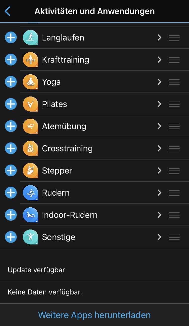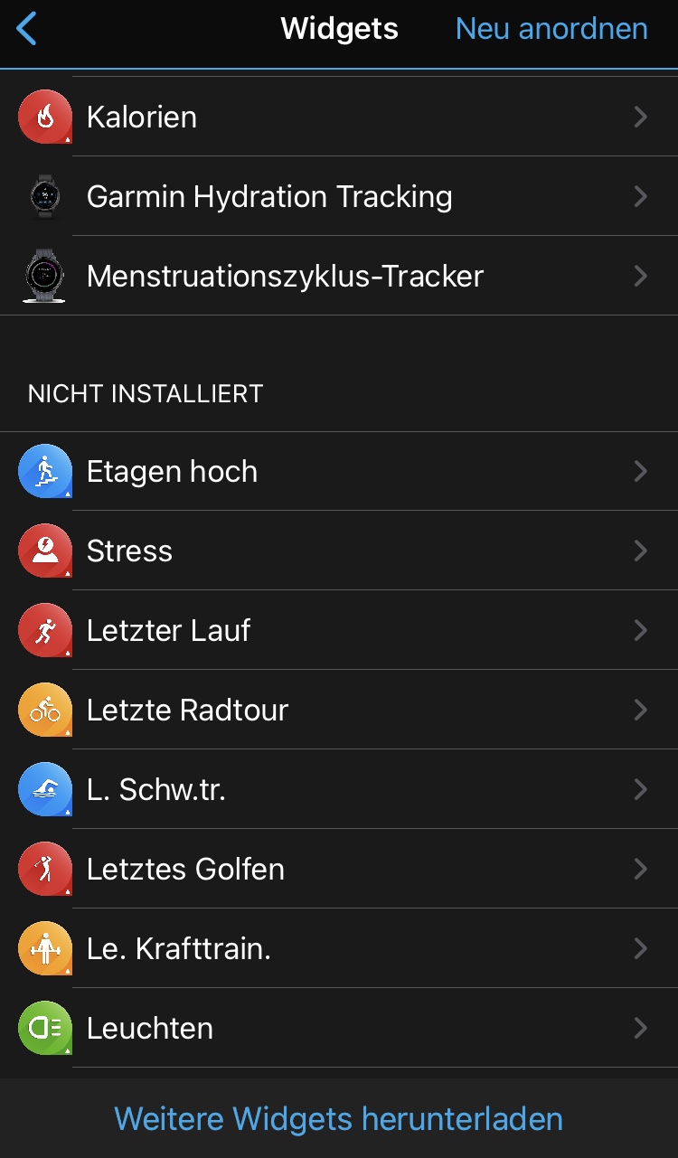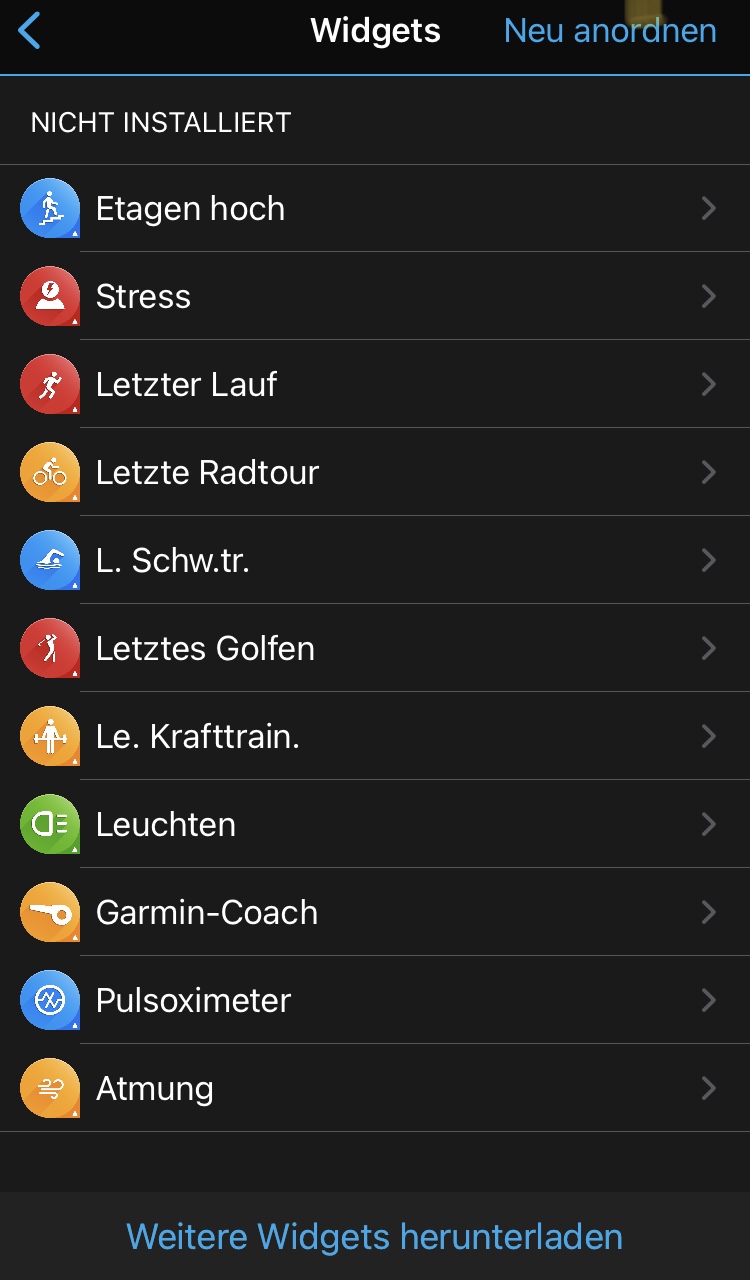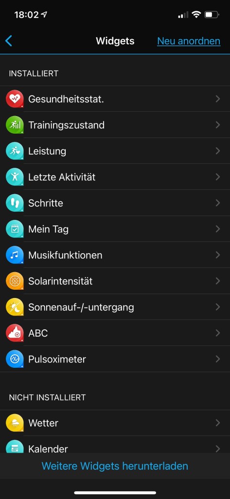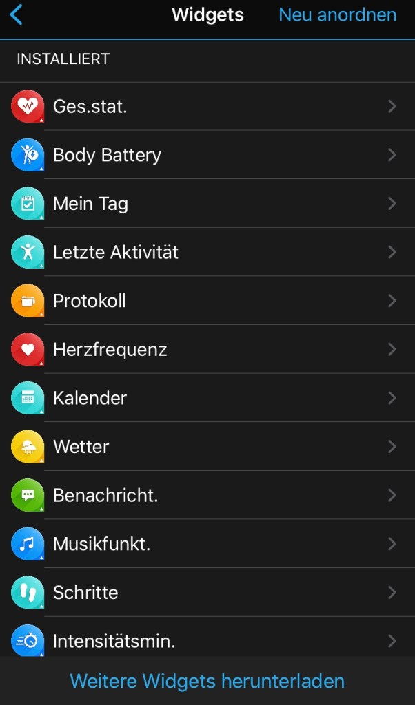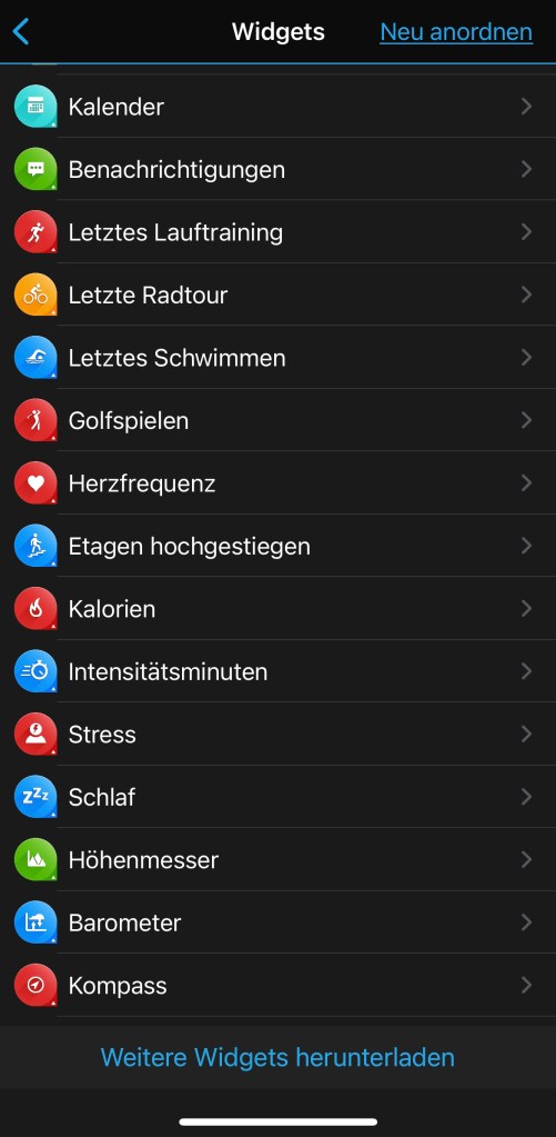 man zu den 38 Widgets. Das sind kleine Infotools, die einen raschen Überblick über den aktuellen Trainingzustand, die letzte Aktivität, Anzahl der Stockwerke bzw. Schritte, sowie die Gesundheitsstatistik ect. geben. Weiters können Daten vom Smartphone wie Kalender oder Benachrichtigungen sowie das Wetter angezeigt werden.