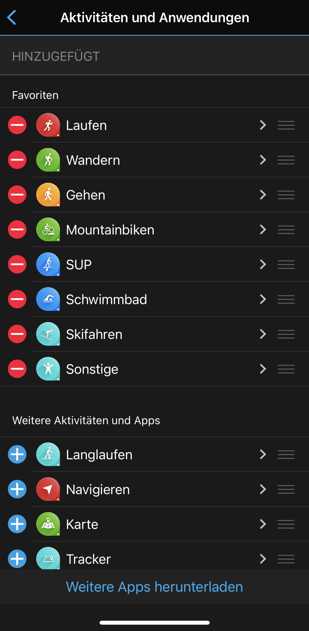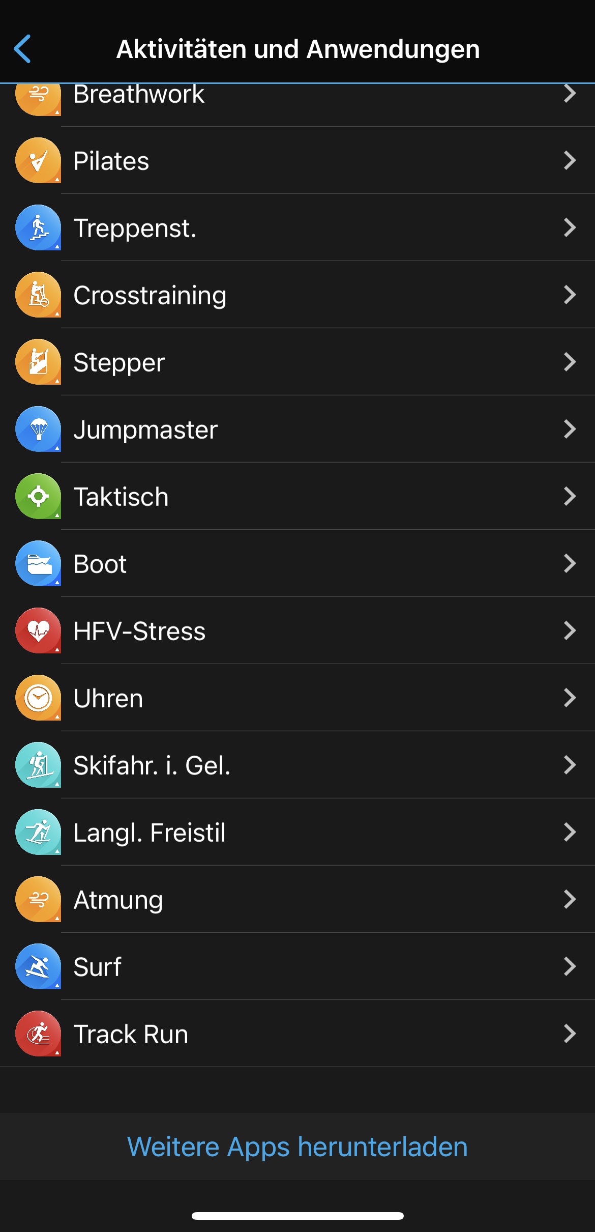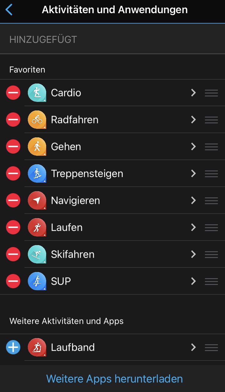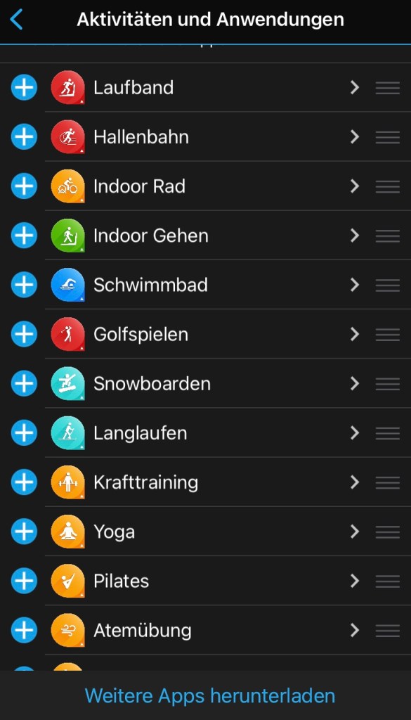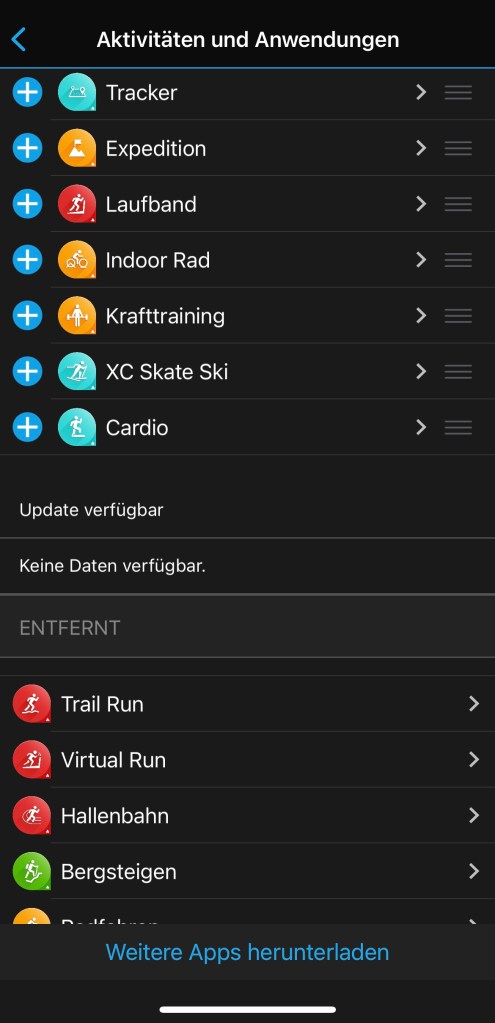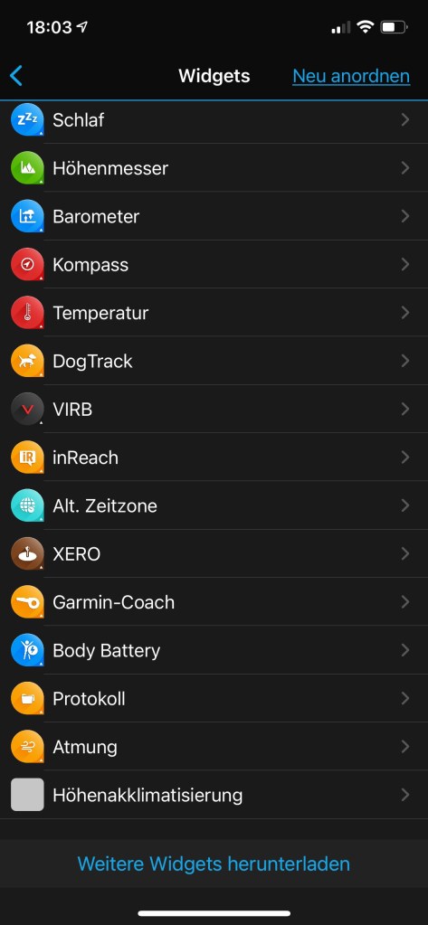 man zu den 38 Widgets. Das sind kleine Infotools, die einen raschen Überblick über den aktuellen Trainingzustand, die letzte Aktivität, Anzahl der Stockwerke bzw. Schritte, sowie die Gesundheitsstatistik ect. geben. Weiters können Daten vom Smartphone wie Kalender oder Benachrichtigungen sowie das Wetter angezeigt werden.