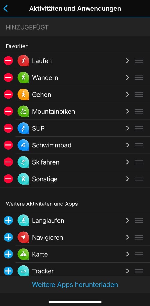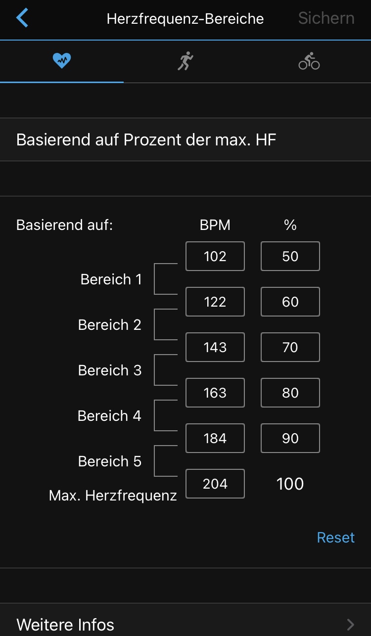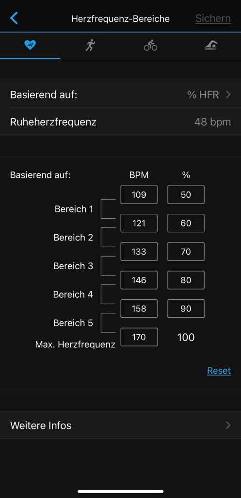 Die Herzfrequenzbereiche können bei der vívoactive 4 für drei und bei der fenix 6 für vier Trainingsarten getrennt eingegeben werden: Laufen, Radfahren, Schwimmen (nur fenix) und ‚Sekundär‘, also alle anderen Sportarten.