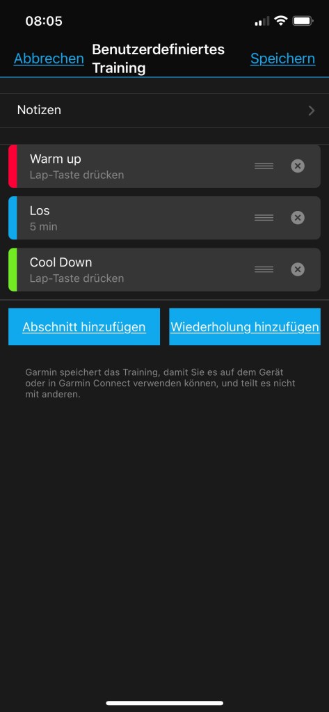 Die Trainingsplanung kann sowohl mittels Garmin Connect – Seite als auch mit der Garmin-Connect-App für Android oder iOS direkt am Smartphone erstellt werden. Die Trainingsplanung sieht auf dem ersten Blick für beide Uhren gleich aus.