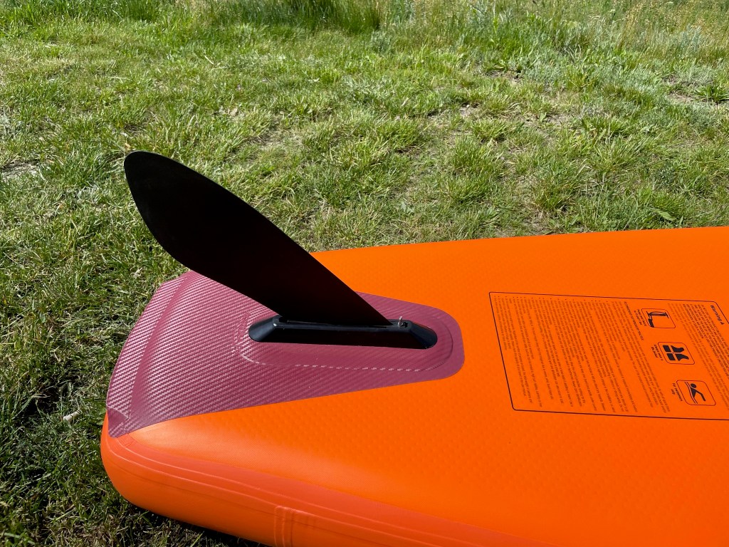 Der Finnenkasten des SportstAir ist relativ kurz und bietet nur Platz für Finnen mit einer Basislänge von max. 14,5cm. Da die mitgelieferte Finne sehr gut zu dem Board passt, hat man nicht wirklich den Bedarf diese auszutauschen. Die Abrisskante am Heck ist schön verarbeitet und macht ihre Arbeit gut.