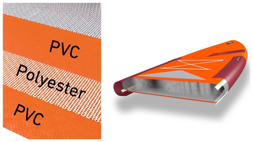 Das SportstAir ist technologisch gesehen eine Mischung aus Schweiß- und Klebetechnik. Zwei PVC- Schichten mit einem dazwischen eingearbeiteten Polyestergewebe werden mit dem Drop Stitch-Gewebe laminiert und am Rand zusammengeschweißt. Darüber kommt noch seitlich eine weitere Lage, die aber aufgeklebt wird. Als wäre das noch nicht genug, kommt über 2/3 des Boards seitlich noch der sogenannte 3D- Stringer.