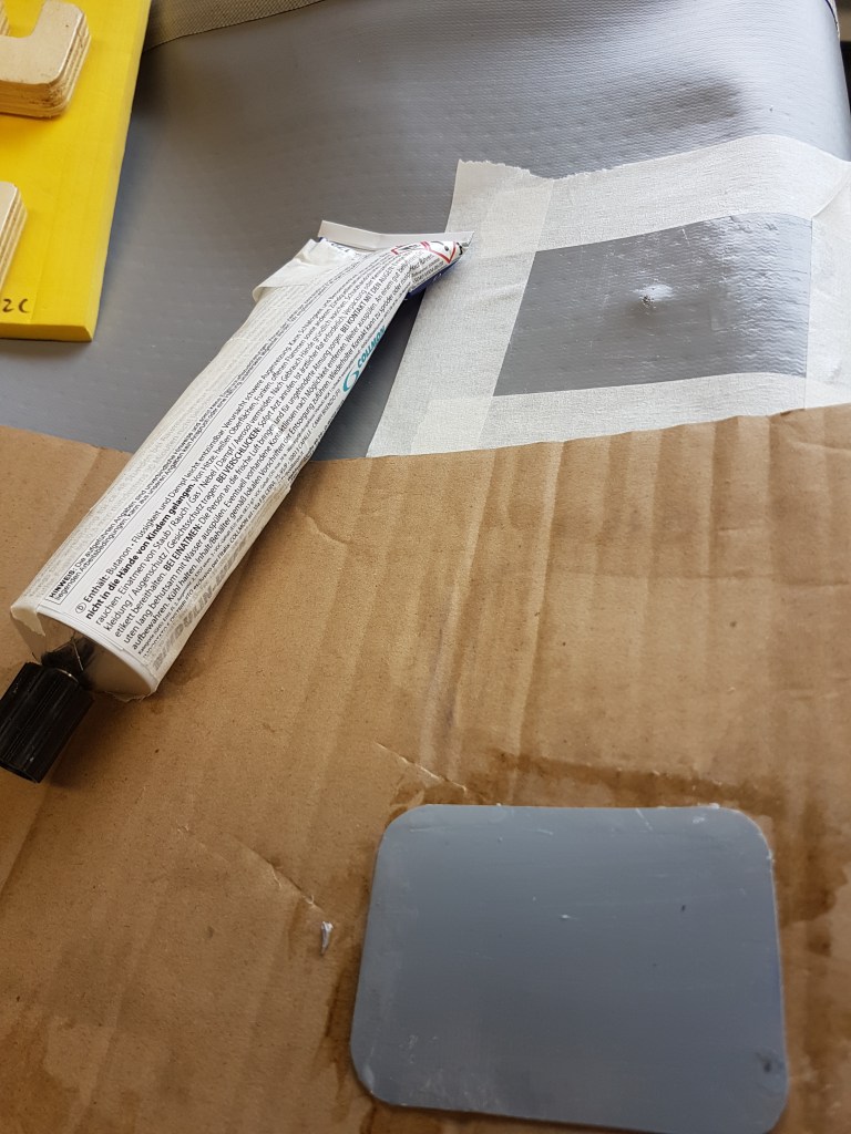Bei vielen Boards sind Tuben mit Kleber dabei. Bis man sie das erste Mal benötigt, sind sie alt und haben ihre Konsistenz und Eigenschaften verändert. Daher packt Starboard, auch aus Umweltschutzgründen, in den letzten Jahren gar keinen Kleber mehr bei.