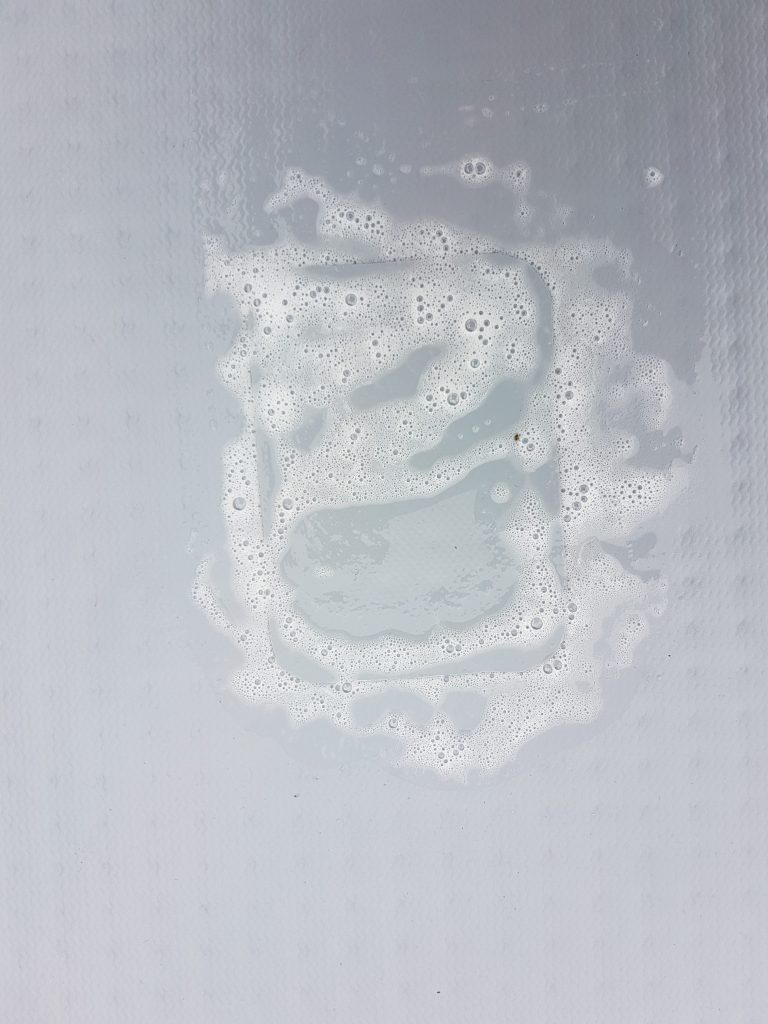 Die Geheimnisse sind die richtigen Zutaten. Welche Chemie-Produkte Christan verwendet hat, hat er uns nicht verraten. Aber nur soviel, er hat Produkte für verschiedene Materialien und verschieden alte SUPs, da sich im Laufe der Zeit das PVC verändert. Auch unterschiedliche Schutzhandschuhe gehören zur Ausrüstung!