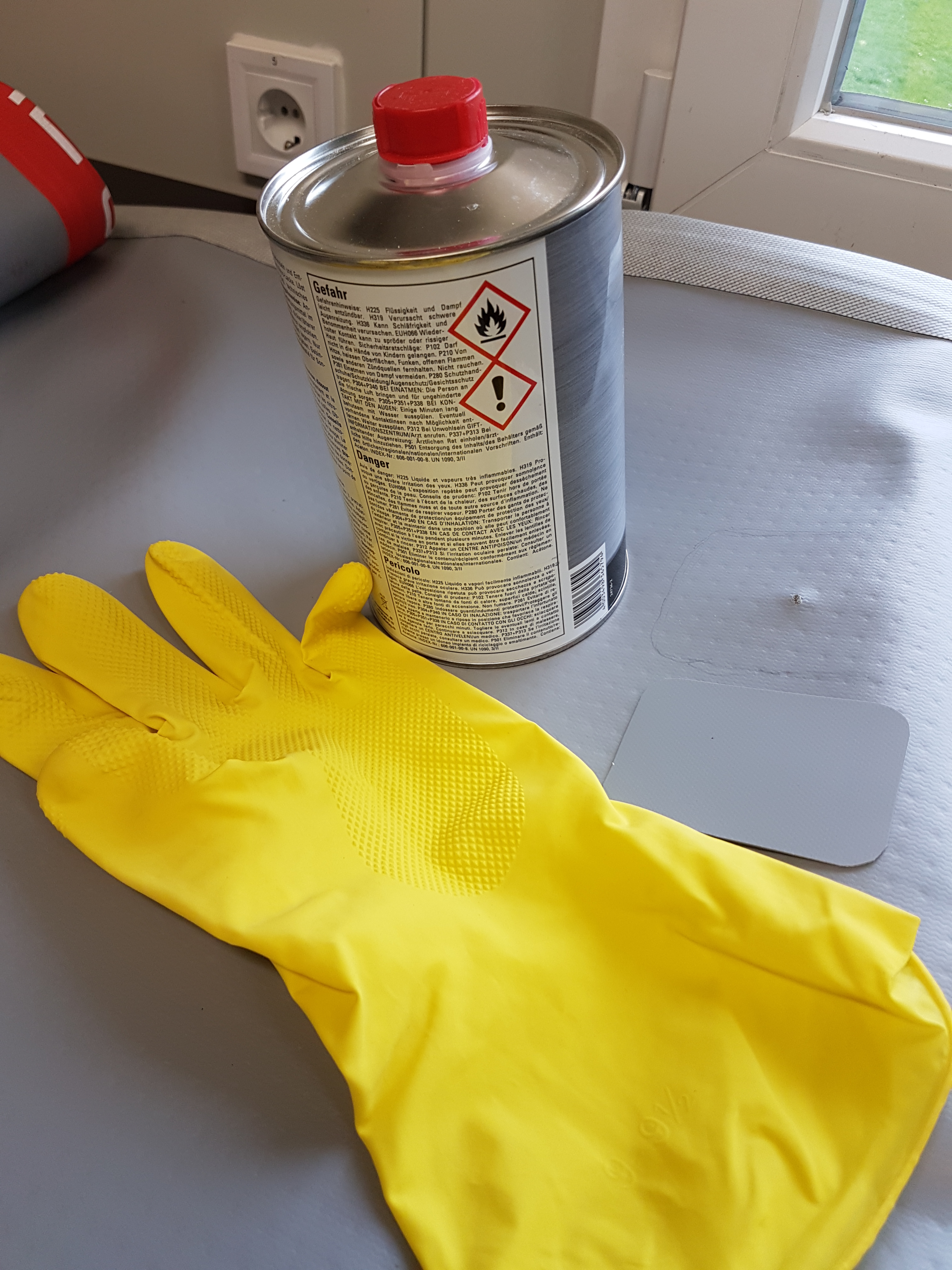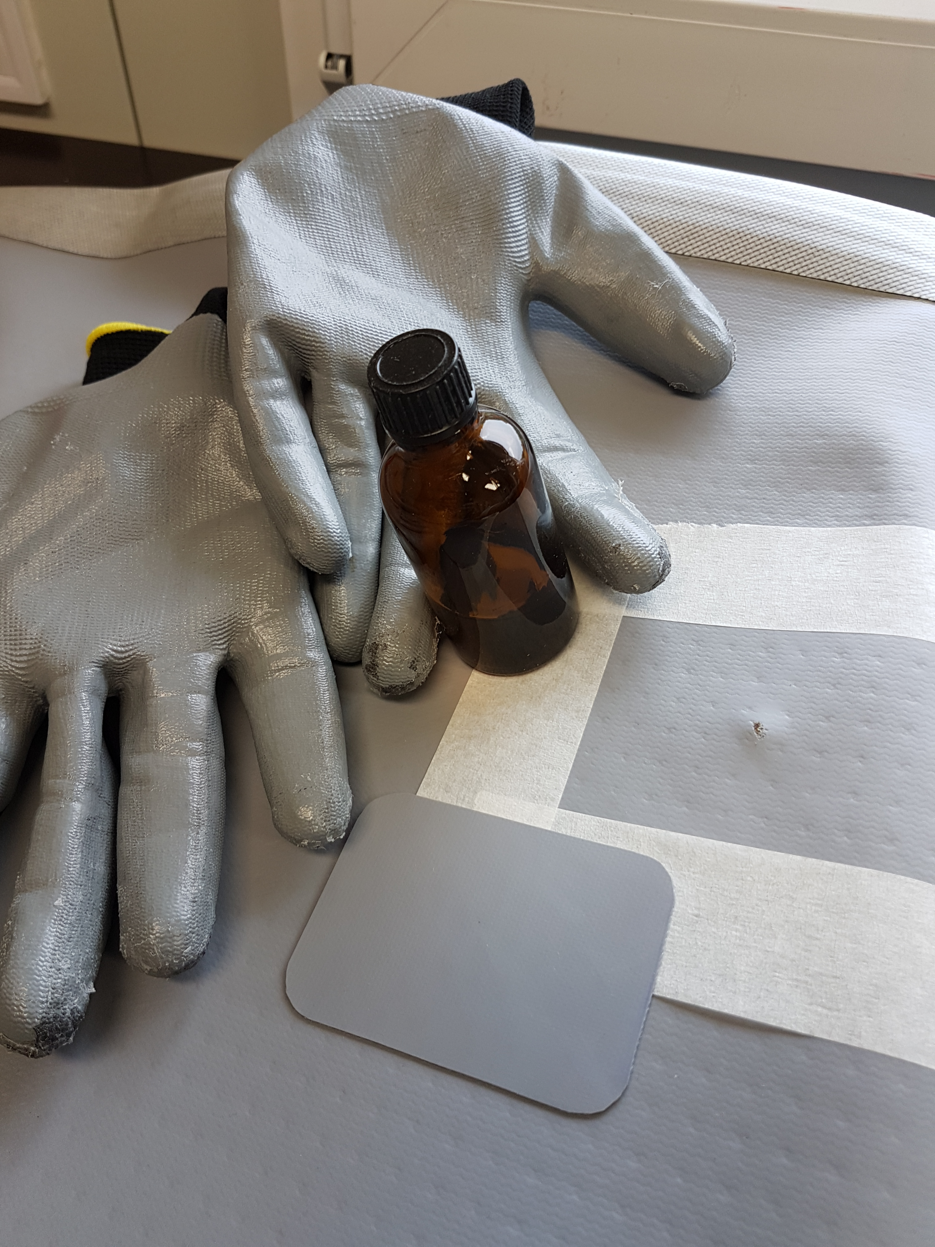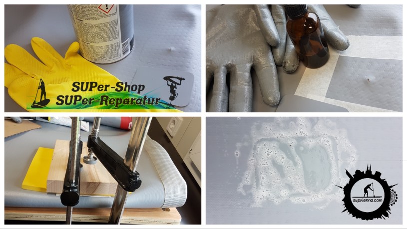 Die Geheimnisse sind die richtigen Zutaten. Welche Chemie-Produkte Christan verwendet hat, hat er uns nicht verraten. Aber nur soviel, er hat Produkte für verschiedene Materialien und verschieden alte SUPs, da sich im Laufe der Zeit das PVC verändert. Auch unterschiedliche Schutzhandschuhe gehören zur Ausrüstung!